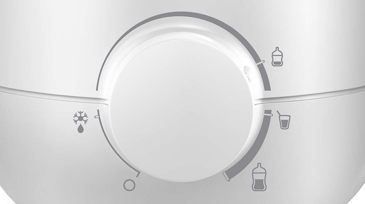 Solo gire la perilla para encender el calentador de mamaderas y seleccione la función de calentamiento. El calentador de mamaderas incluye una útil tabla de referencia sobre calentamiento para que pueda calcular fácilmente cuánto tiempo tomará.